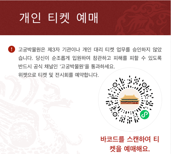 중국의 대표 메신저앱인 '위챗'을 사용해 고궁박물원(The Palace Museum, 故宫博物院)사전방문 예약 및 티켓구매를 합니다. 자금성내에 고궁박물원이 위치하고 있고, 이 곳의 티켓을 구매해야 자금성 입장이 가능한것이니 혼동 없으시길 바랍니다. 위챗의 QR코드 스캔 기능을 이용해 아래 바코드를 스캔하면 예약 페이지로 이동합니다.